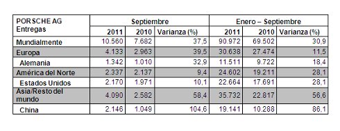 Durante el pasado mes de septiembre Porsche ha registrado un aumento significativo de sus ventas, un 37.5 % más en comparación con el mismo mes del año anterior, totalizando una entrega de 10.560 vehículos en todo el mundo. Entre enero y septiembre de este año, Porsche ha entregado un total de 90.972 automóviles nuevos, lo que también representa un aumento del 30,9% en comparación con el mismo período de 2010.