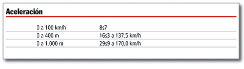Desde la óptica de potencia, los registros de aceleración desde 0 en las tres referencias que se controlan son sólo aceptables, pero lógicos por la pérdida en el resbalamiento del acople hidráulico de la transmisión en cada paso de marcha, el rendimiento mecánico de la caja automática hepicicloidal y el peso en orden de marcha.