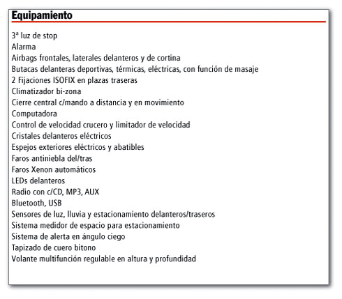 El tablero, desplazado del centro hacia la línea de visión del conductor, cuenta con medidores digitales de marco redondo, mientras que el velocímetro es analógico (con aguja) -corrido 3 km/h en toda la escala-. El volante, con sector recto en la base, es multifunción en todo su significado dado que sin quitar las manos de la empuñadura revestida en cuero, es posible operar el audio, la telefonía celular y el control de velocidad. Prevalecen las perillas redondas en el resto de los mandos del climatizador bi-zona y en el completo equipo de audio que suma también algunas teclas; este último se aprovecha en toda su dimensión por la correcta insonorización del habitáculo.