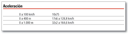 Partiendo desde 0 necesitó 10s75 para alcanzar 100 km/h, cubrió los 1.000 m en 32s2 donde pasa a casi 165 km/h.