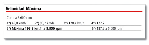 La velocidad de punta se alcanza en 5ª, el promedio fue 193,6 km/h a casi 6.000 rpm; en 6ª no supera las 5.000 rpm con poco más de 185 km/h de promedio.