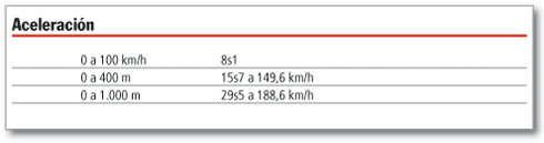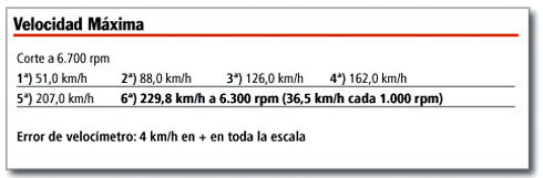 En la prueba de 0 a 100 km/h, moderando la presión sobre el pedal, el registro promedio es de 8s1, cubre el cuarto de milla en 15s7 alcanzando casi 150 km/h en esa referencia y pasa en el kilómetro a 188,6 km/h marcando los 28s45 enel reloj.Tanto en 5ª como en 6ª, supera los 200 km/h y en esta última orilló los 230 km/h a 6.300 rpm. La dirección directa con asistencia reducida transmite la sensación exacta que permite disfrutar el carácter deportivo del modelo, pero viajando rápido requiere mayor atención para llevar el volante.