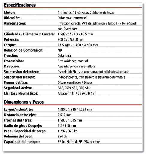 Si bien en los autos deportivos con 200 CV de potencia, el consumo no es uno de los aspectos prioritarios a tener en cuenta en su desarrollo, las reglamentaciones a cumplir en el primer mundo para homologar autos y la tecnología destacada de este motor -inyección directa, turbo compresor con doble entrada (Twin-Scroll) overboost e intercoller-, son las razones para la comprobada economía de combustible. A 130 km/h, la velocidad máxima permitida en las ¿autopistas? en Argentina, necesitó 7.9 lts/100 km con una atuonomía de casi 700 km. En el circuito urbano fueron 8.1 lts/100 km y 680 km de autonomía. Eso sí, no recomendamos comprobar esto sin escalas, para evitar dolores musculares y de estructura ósea.