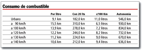 En relación a ésto el consumo es austero por potencia, peso y tamaño del auto. En ciudad fueron 11 litros para los 100 km. A 90 km/h en autopista, referencia por lo general utilizada por las automotrices por razones de marketing, recorre más de 300 km con 20 litros. Circulando a la velocidad permitida en la Panamericana -130 km/h- califica muy bien el rendimiento de motor y transmisión por los 8.95 litros que necesita para recorrer un centenar de kilómetros, especialmente por la importante área frontal del modelo y el Cx 0.33 homologado.