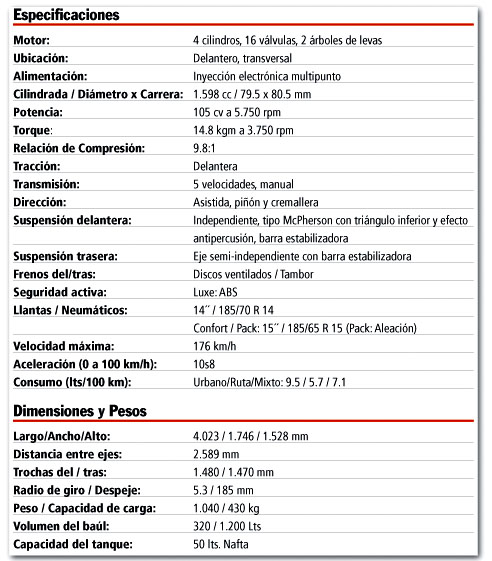 Probamos la versión tope de gama -Luxe- impulsada por el motor naftero 1.6 -de 105 CV y 16 V- asociado a una caja manual de cinco velocidades. Entre los componentes de su equipamiento se destacan: ABS, airbags frontales, llantas de aleación, aire acondicionado, alarma, USB, Bluetooth, levantacristales eléctricos. El precio vigente desde el 1 de noviembre es de $ 78.900.-