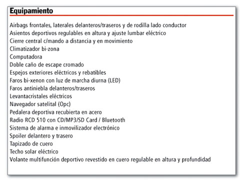 El interior luce sobrio y elegante, contrastando los tonos oscuros con apliques y contornos de color metálico brillante y aluminio pulido. Estos últimos y las costuras en los tapizados de cuero más el del fuelle del pomo de la palanca de cambios, le dan el toque deportivo al diseño. Los materiales utlizados, como así también la precisión en terminaciones y empalmes son del mejor nivel entre los productos de Volkswagen.