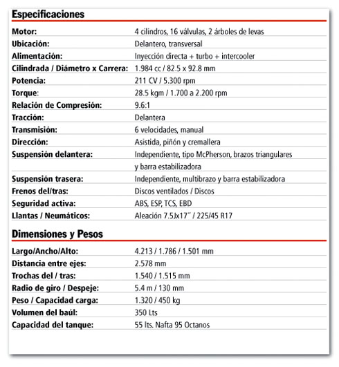 Si el piso es bueno y el tránsito civilizado, el importante torque y la amplia escala de rpm en que se manifiesta, en 5° ó 6°, según sea la velocidad permitida no requiere realizar cambios, es como si la caja fuera automática. Esto se debe, en parte porque el motor se hace notar a poco de alcanzar las 2.000 rpm hasta casi el corte a 7.000 rpm, pero indudablemente están bien relacionadas las 6 marchas de la caja mecánica. La selectora es de lo mejor, precisa, de recorridos cortos, se “chupa” el cambio a poco de empujar la palanca. El crecimiento en trochas y distancia entre ejes, los valores elásticos elegidos para asistir un rodado con 205 de banda, perfil 45 calzado en llantas 17″ y la eficiencia de las barras de control de rolido adelante y atrás, permiten aprovechar la importante energía disponible para disfrutar y divertirse manejando el auto.