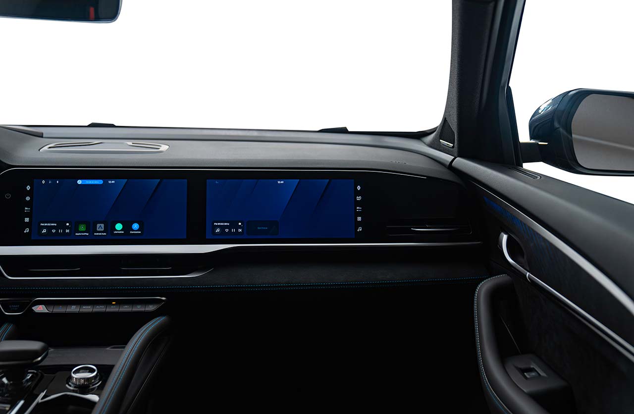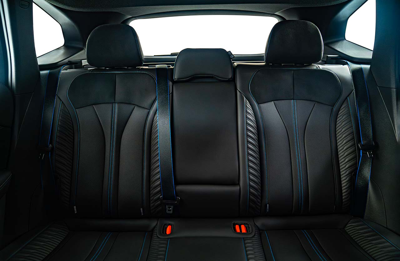 La seguridad consta de siete airbags, asistencia activa al conductor, mantenimiento de carril, cambio de carril automático, control crucero adaptativo, función de chasis transparente, estacionamiento autónomo, cámara panorámica 360° 3D, frenado autónomo (delantero y trasero), luces altas y bajas automáticas, alerta de punto ciego y asistencia de maniobra evasiva.