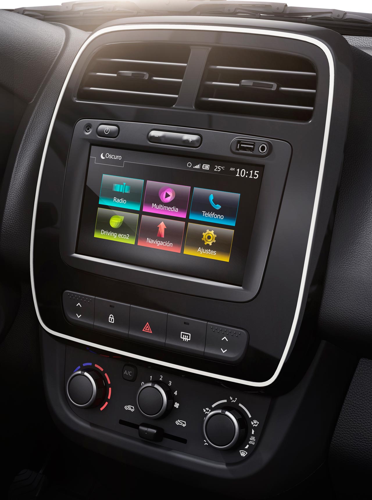 En otra de las imágenes se puede ver la plancha central completa, donde el Kwid cuenta con un climatizador manual y el sistema Media Nav con pantalla táctil, entrada USB y navegador satelital.