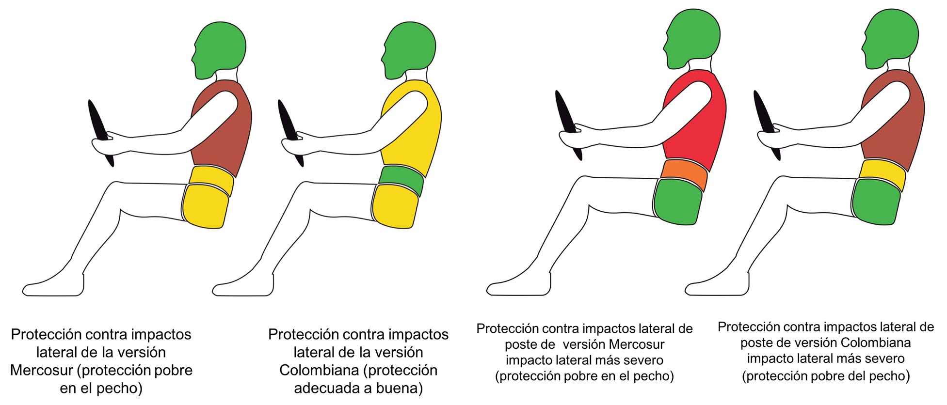 Estas tres diferencias se traducen en una mejor protección contra impactos laterales e impactos laterales de poste de la versión colombiana sobre la versión Mercosur.