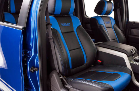 Como es costumbre, la personalización provista por Shelby se ha extendido también al habitáculo, ambiente en el que esta pick up -del segmento full size- incluye butacas deportivas y tapizados que combinan los colores colores azul y negro.