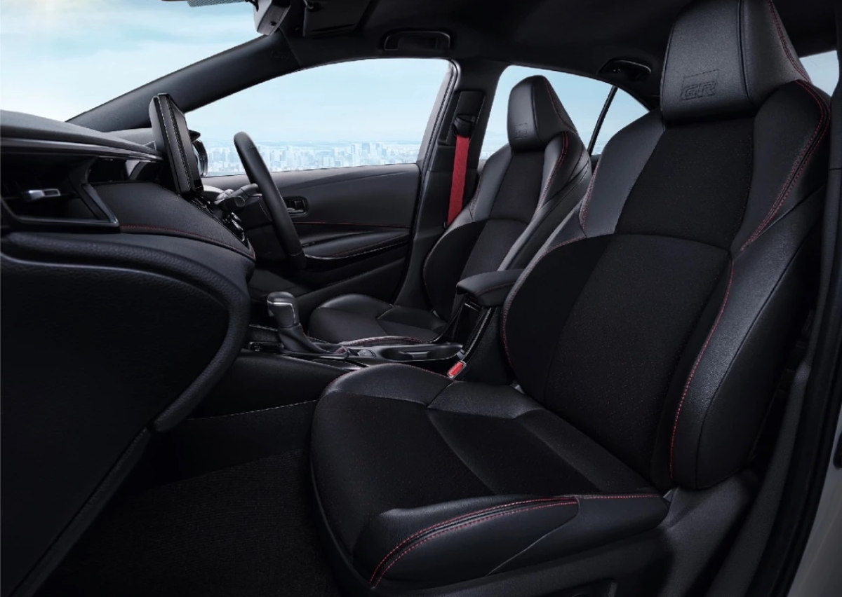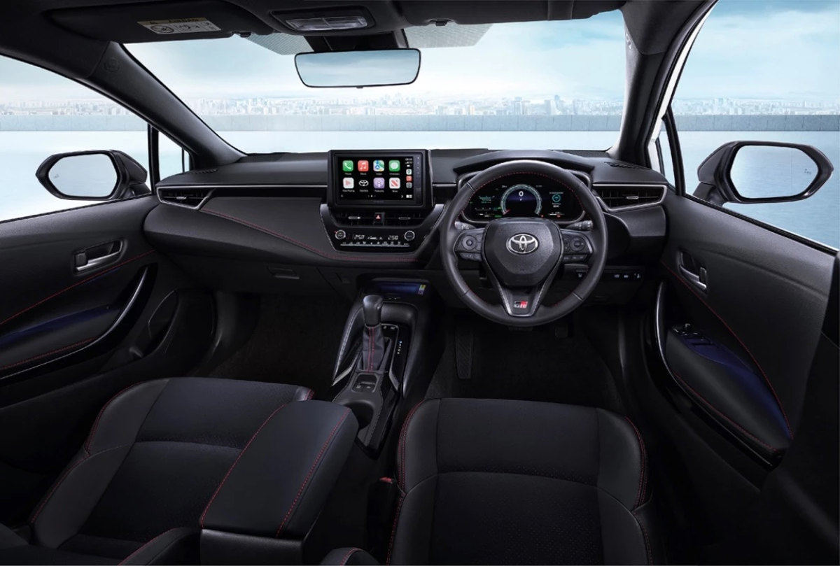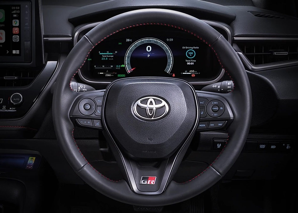En el interior del Corolla Altis GR Sport híbrido hay una combinación del color negro con el rojo, presente en las diversas costuras (incluidas las del panel y los tapizados) y los cinturones de seguridad. Por su parte, el volante tiene el emblema de Gazoo Racing.