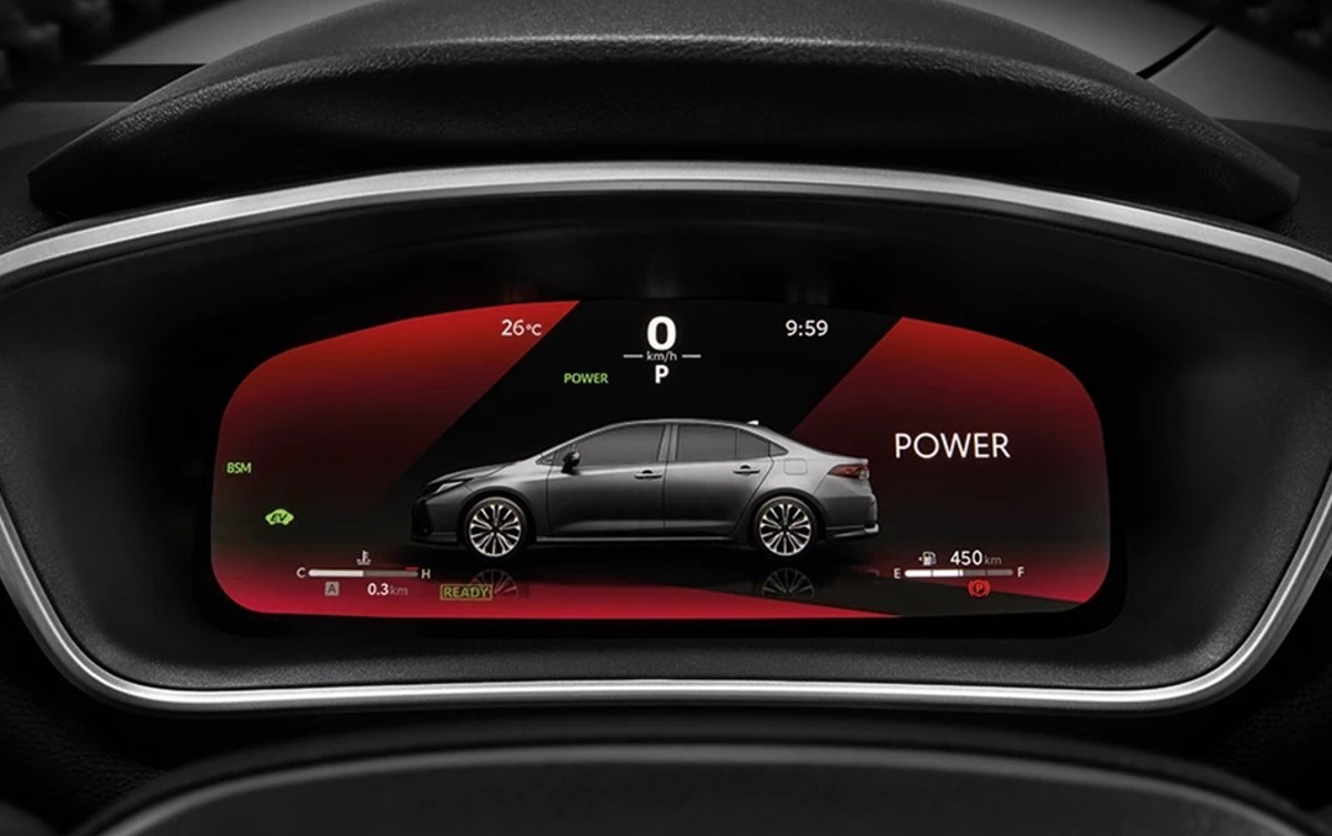 El equipamiento de este Corolla contiene tablero digital de 12,3 pulgadas, pantalla táctil de 9”, conectividad inalámbrica (Android Auto y Apple CarPlay), luces LED, cargador inalámbrico, climatizador bizona, acceso sin llave, proyector de datos en parabrisas, frenado automático de emergencia, luces altas automáticas, advertencia de punto ciego y mantenimiento de carril.