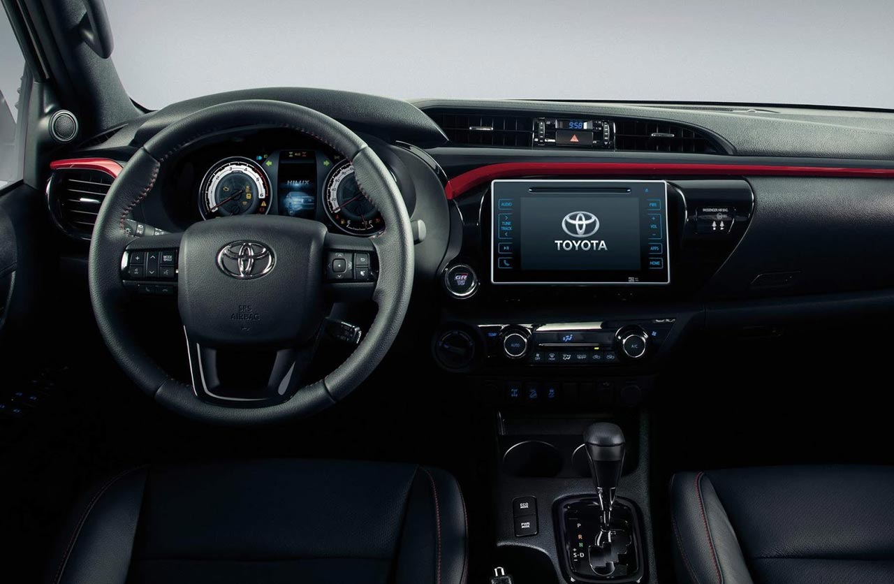 En el interior, la Hilux GR Sport asocia los colores oscuros con los detalles rojos, además de incluir botón de arranque personalizados, una placa numerada (serán 1300 unidades en total, 500 para Argentina, 420 para Brasil y el resto para otros países de nuestra región) y tapizado con cuero perforado, costuras rojas y logotipo “GR” en los apoyacabezas.