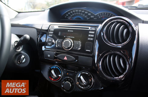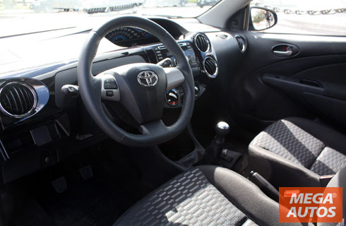 El espacio interior del Etios permite ubicar a cinco pasajeros adultos, aunque falta un quinto apoyacabeza y cinturón de seguridad de tres puntos en la quinta plaza. Tanto el espacio para la cabeza, como para las piernas en las plazas traseras es amplio.