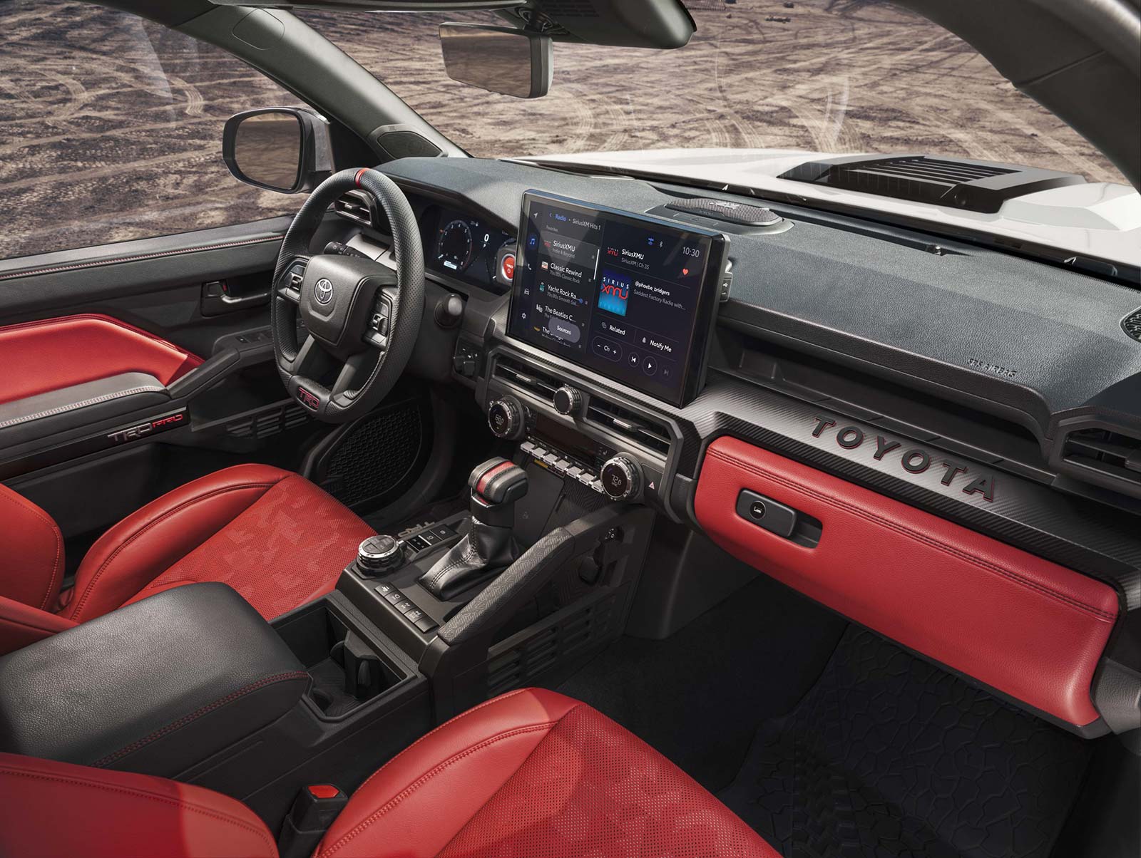 El interior presenta una evolución que incluye tablero digital y pantalla central con hasta 14 pulgadas. Además, la TRD Pro posee llamativos asientos con amortiguación para mejorar el control y la comodidad en la conducción todoterreno, para lo que también ofrece el control de crucero de baja velocidad.