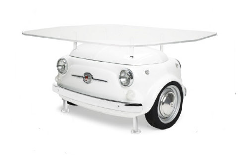 Finalmente, la mesa “Picnic” posee una estructura que parte de la unión de la región frontal de un Fiat 500. Sobre esta base se apoya un cristal templado transparente adicional, vinculado a la base con soportes de aluminio pulido. Las ruedas laterales tienen un acabado de poliuretano flexible en color negro.