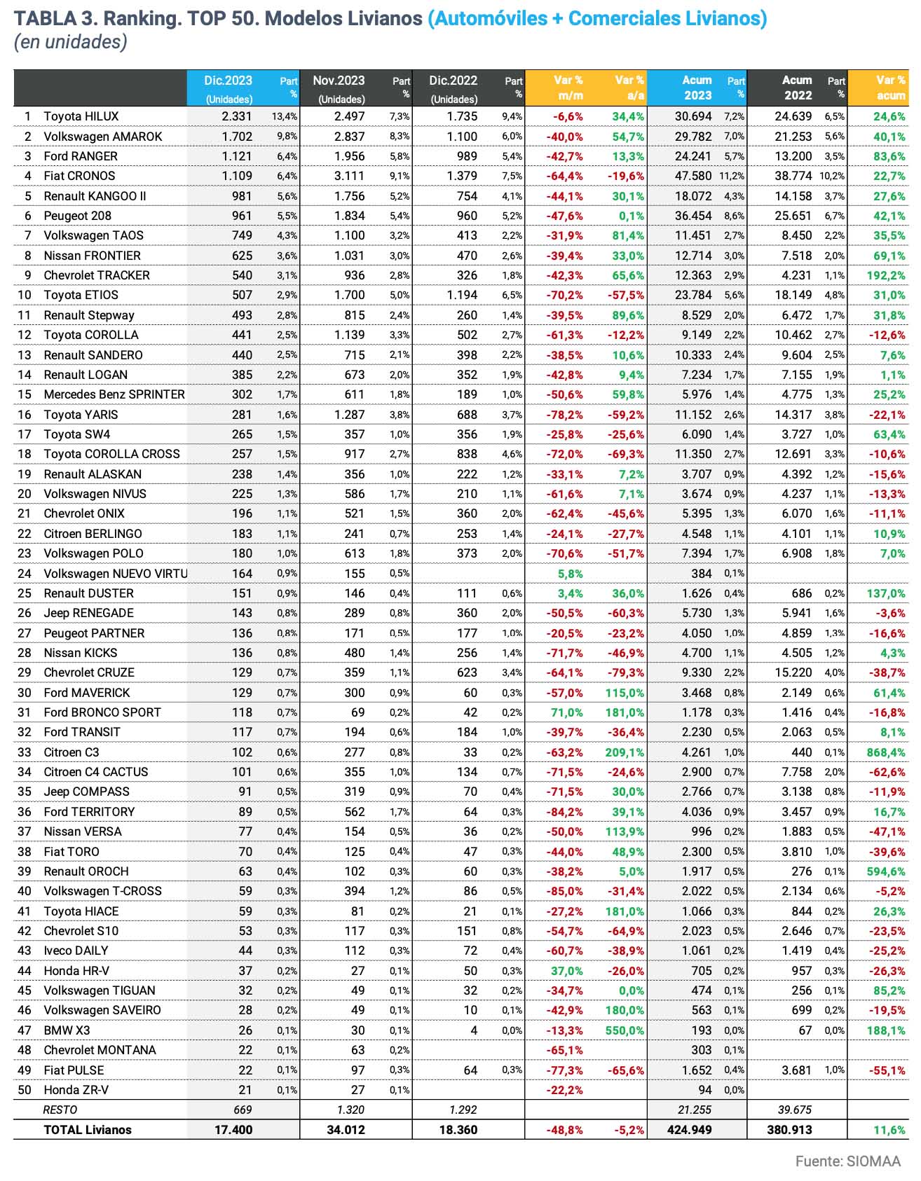 En diciembre, la ganadora fue la Toyota Hilux con 2.331 unidades que le permitieron superar a las Volkswagen Amarok (1.702) y Ford Ranger (1.121). Después se colocaron los Fiat Cronos (1.109), Renault Kangoo (981), Peugeot 208 (961) y Volkswagen Taos (749), las Nissan Frontier (625) y Chevrolet Tracker (540) y el Toyota Etios (507).