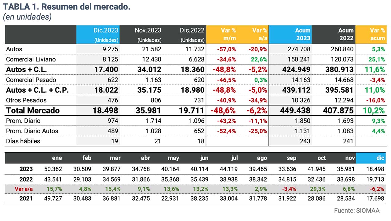 Con las 18.498 unidades en diciembre (6,2% menos que en igual mes de 2022), el mercado cerró 2023 con 449.438 unidades patentadas en los doce meses de año; fue un volumen 10,2% más elevado que en el mismo período del año pasado (407.875 unidades).