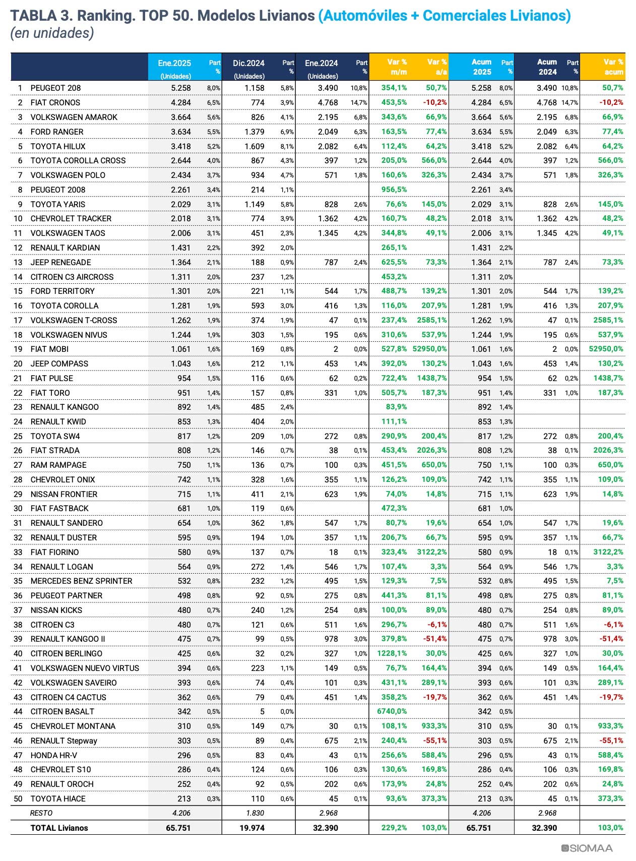 La lista continúa con la presencia de Peugeot (8.143 unidades), Renault (6.206), Ford (5.419), Chevrolet (3.740), Citroën (3.046), Jeep (2.494) y Nissan, que completó los diez primeros lugares con 1.421 vehículos registrados.