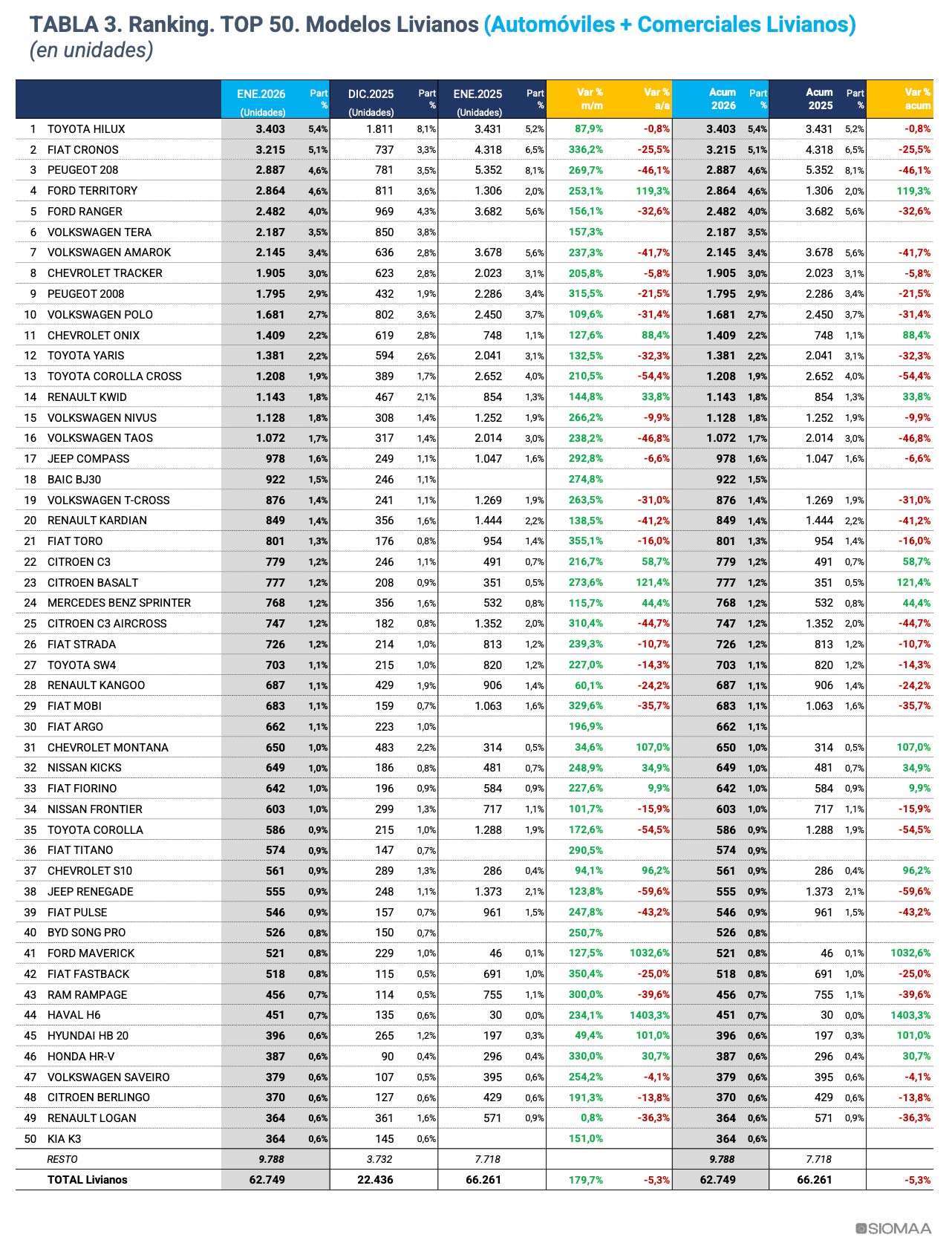 La lista de marcas además tiene la presencia de Chevrolet con 5.104 unidades, Renault con 4.618, Citroën con 2.733, Jeep con 1.662 y Nissan con 1.597 cerrando el “top ten” de enero.