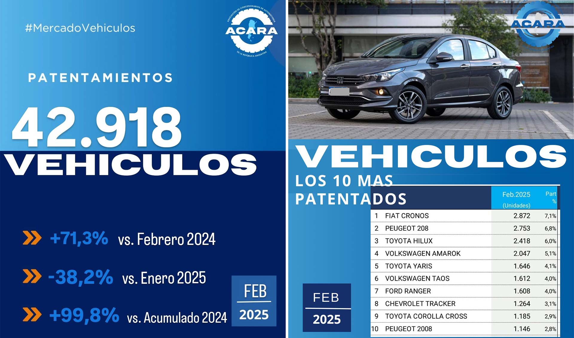En el mercado argentino de vehículos 0 km se patentaron 42.918 unidades en febrero de 2025, según anunció la Asociación de Concesionarios de Automotores de la República Argentina (ACARA) a través de su informe mensual.
