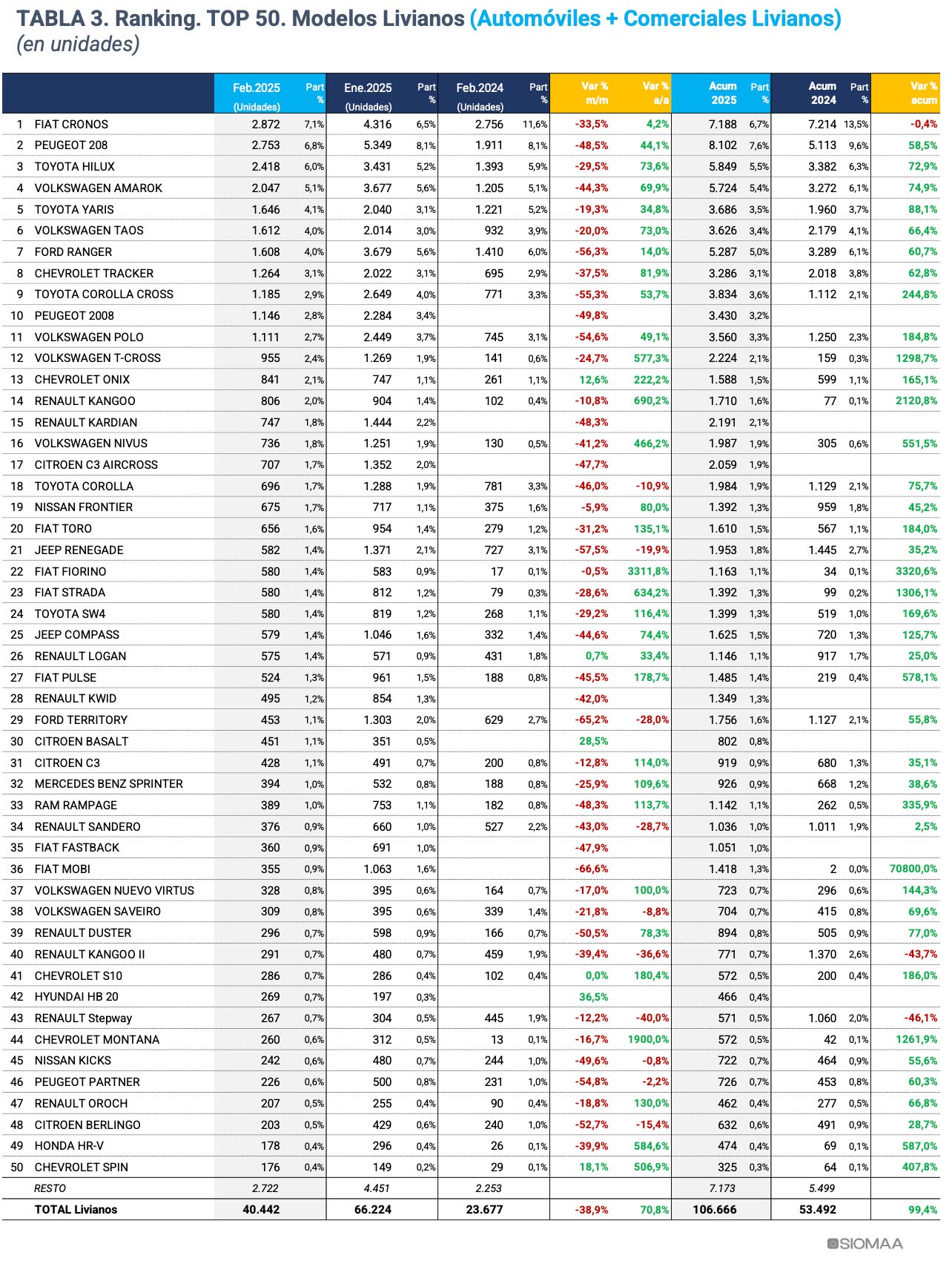 Entre los autos, el Fiat Cronos nacional fue nuevamente el más patentado con 2.872 unidades registradas en febrero. Superó al Peugeot 208 argentino (2.753 unidades), y a la Toyota Hilux nacional (2.418 vehículos).