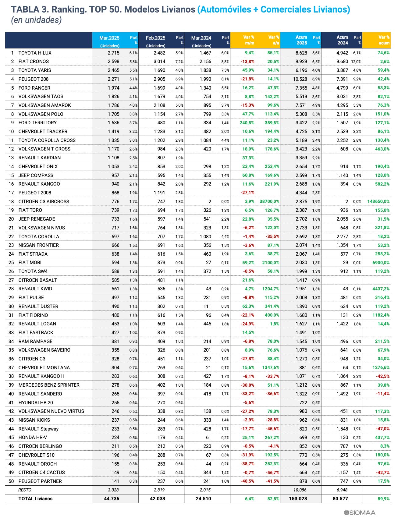 Entre los modelos, la Toyota Hilux fabricada en Argentina fue nuevamente líder con 2.715 unidades registradas. La siguieron el Fiat Cronos nacional (2.598) y el Toyota Yaris brasileño (2.465). Por su parte, el Peugeot 208 fue cuarto con 2.271 unidades y la Ford Ranger fue quinta con 1.974 vehículos.