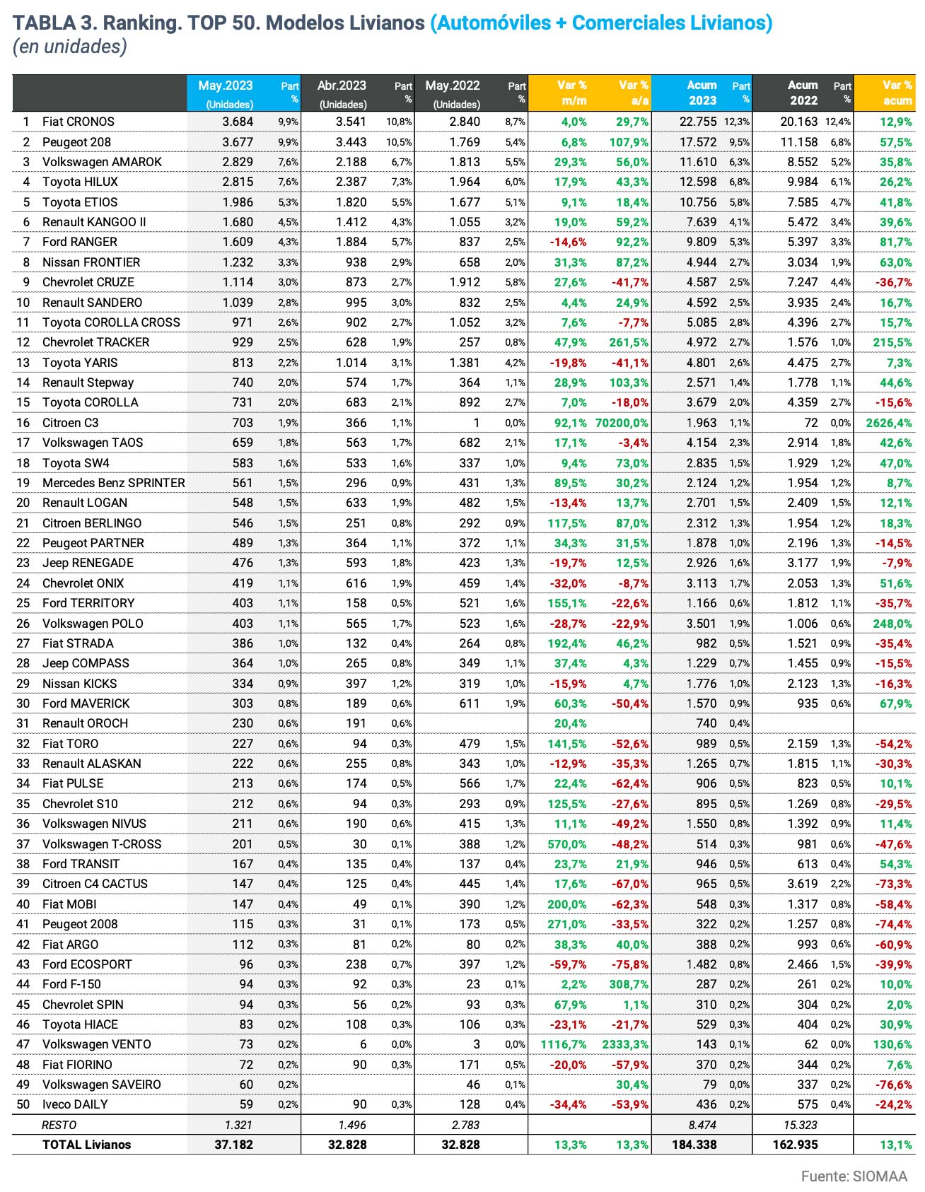 El Fiat Cronos fue nuevamente líder entre los autos con 3.684 unidades registradas. También se destacaron otros productos nacionales: el Peugeot 208 (3.677 unidades) y la Volkswagen Amarok (2.829), que superó a la Hilux.