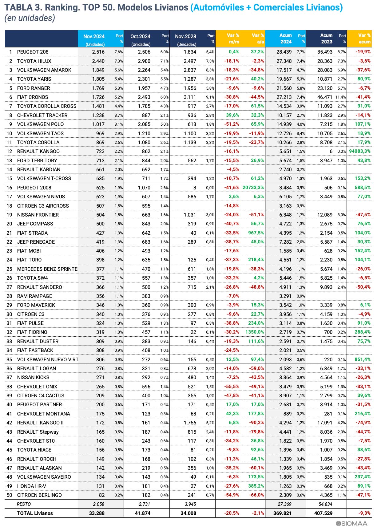 Entre los autos, el Peugeot 208 se convirtió en el modelo más vendido del país con 2.516 unidades patentadas. La Toyota Hilux cayó al segundo lugar con 2.440 vehículos y la Volkswagen Amarok fue tercera con 1.849 unidades.