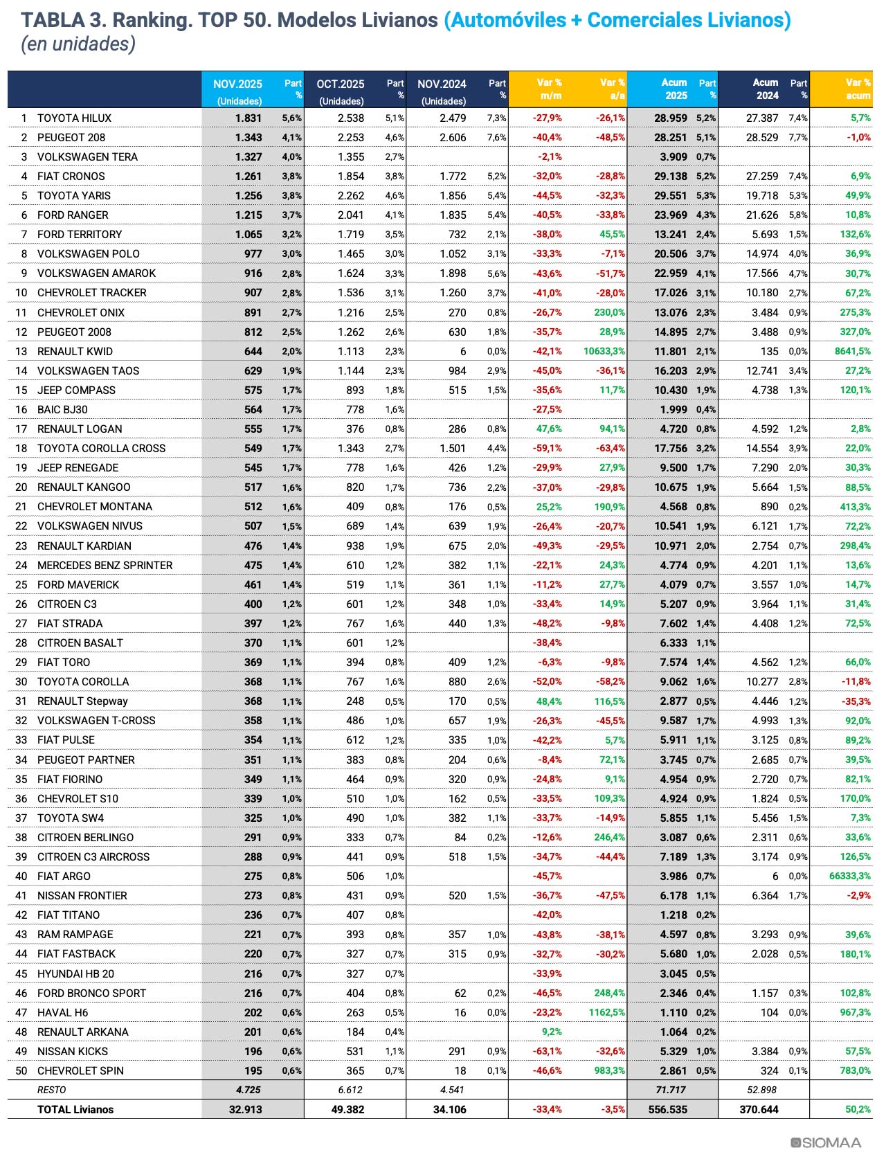 Los modelos que completaron el “top ten” de noviembre: Fiat Cronos (1.261 unidades), Toyota Yaris (1.256), Ford Ranger (1.215), Ford Territory (1.065), Volkswagen Polo (977), Volkswagen Amarok (916) y Chevrolet Tracker (907).