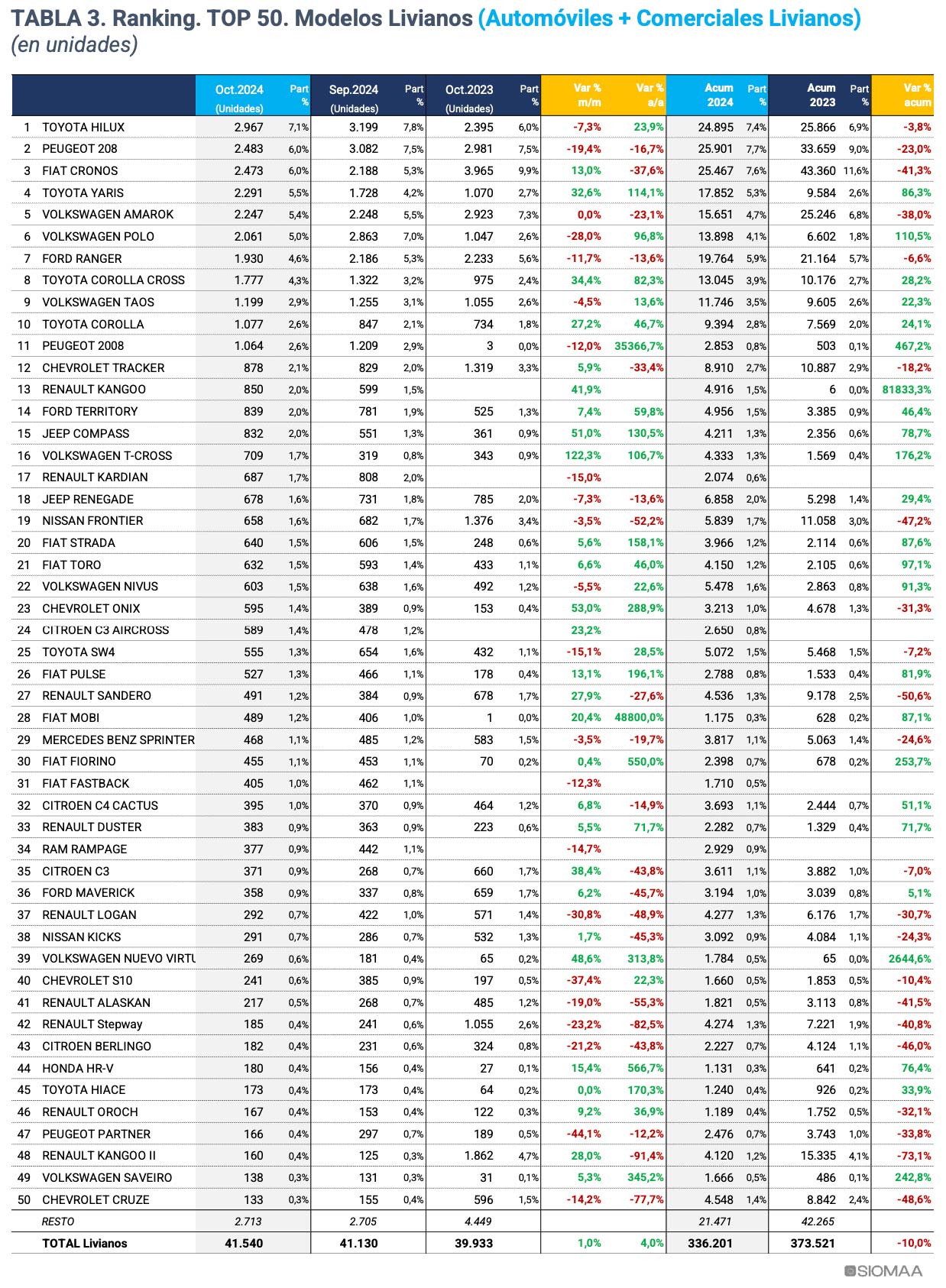 La Toyota Hilux argentina se destacó entre los modelos gracias a sus 2.967 unidades de octubre. Superó a otros modelos producidos en el país: el Peugeot 208 con 2.483 vehículos y el Fiat Cronos con 2.473 unidades.