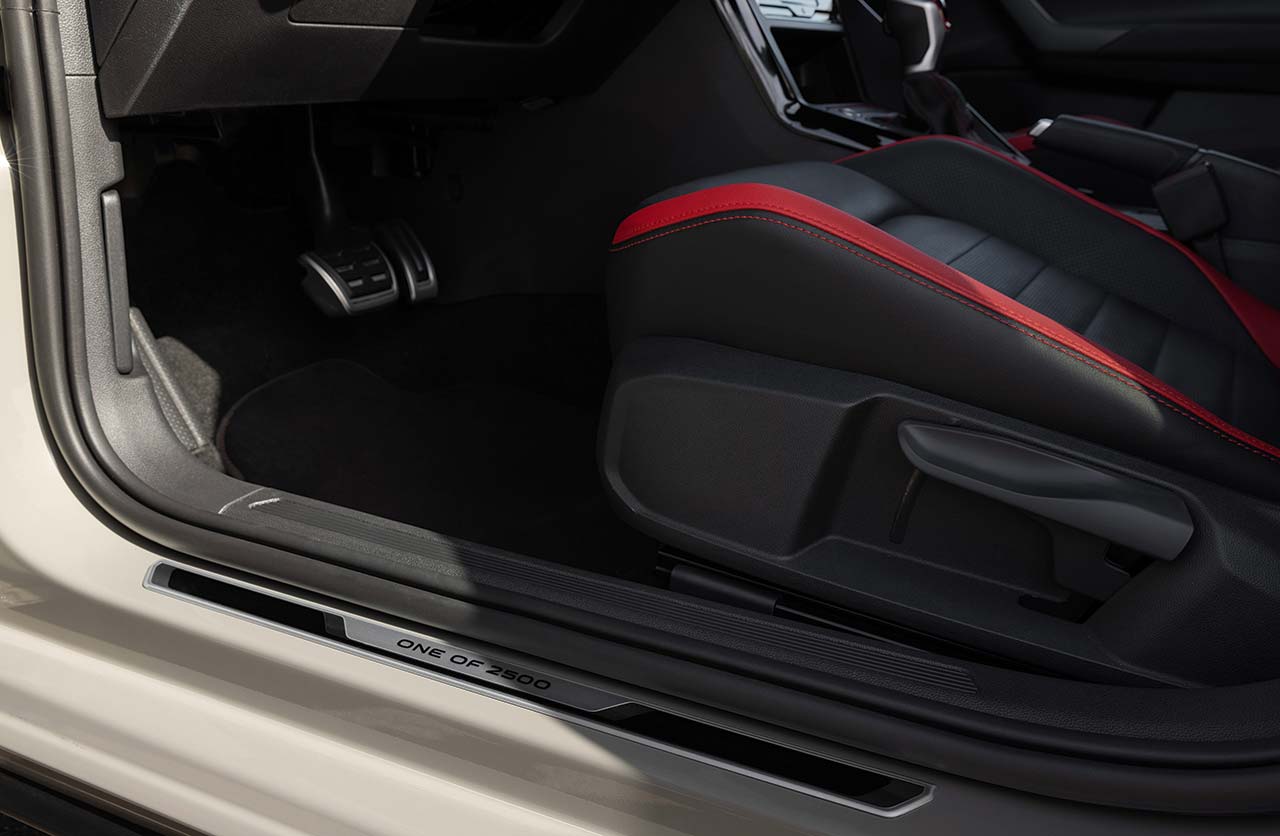 Puertas adentro cuenta con la placa “One of 2500” para anunciar que es una de las unidades de la edición. Un detalle que se suma a la configuración conocida, que incluye asientos deportivos con apliques rojos y sigla de la versión.