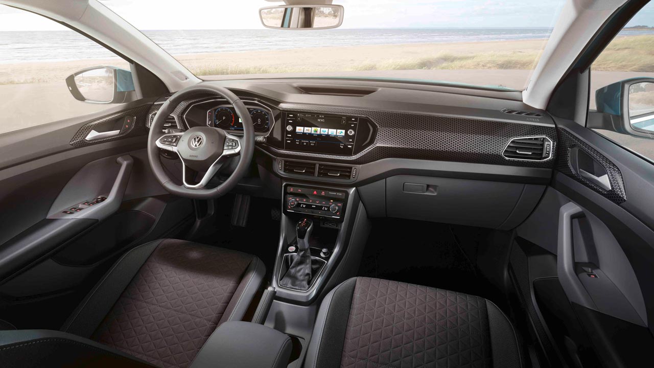 Una de las opciones exhibidas por Volkswagen incluye plásticos negros en los paragolpes y los zócalos laterales, además de llantas de aleación con color alineado al de la carrocería, lo mismo que sucede con una parte del panel de a bordo en el interior.